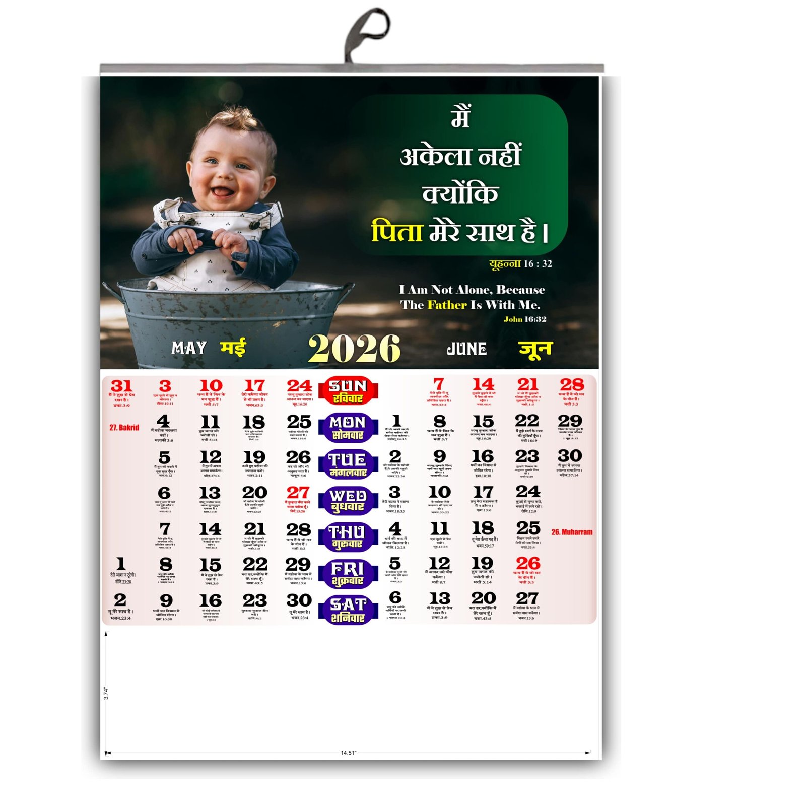 Each month features a breathtaking image—alternating between serene flowers and adorable babies—paired with an uplifting Bible verse in clear, easy-to-read English. The calendar grid itself is presented in both Hindi and English, making it perfect for bilingual families and communities.