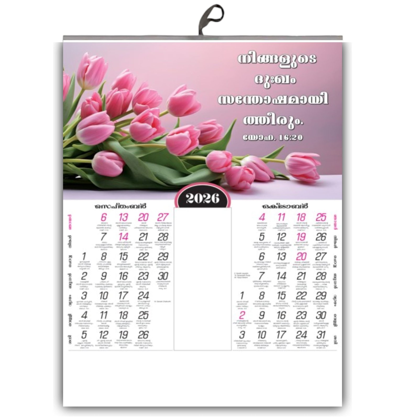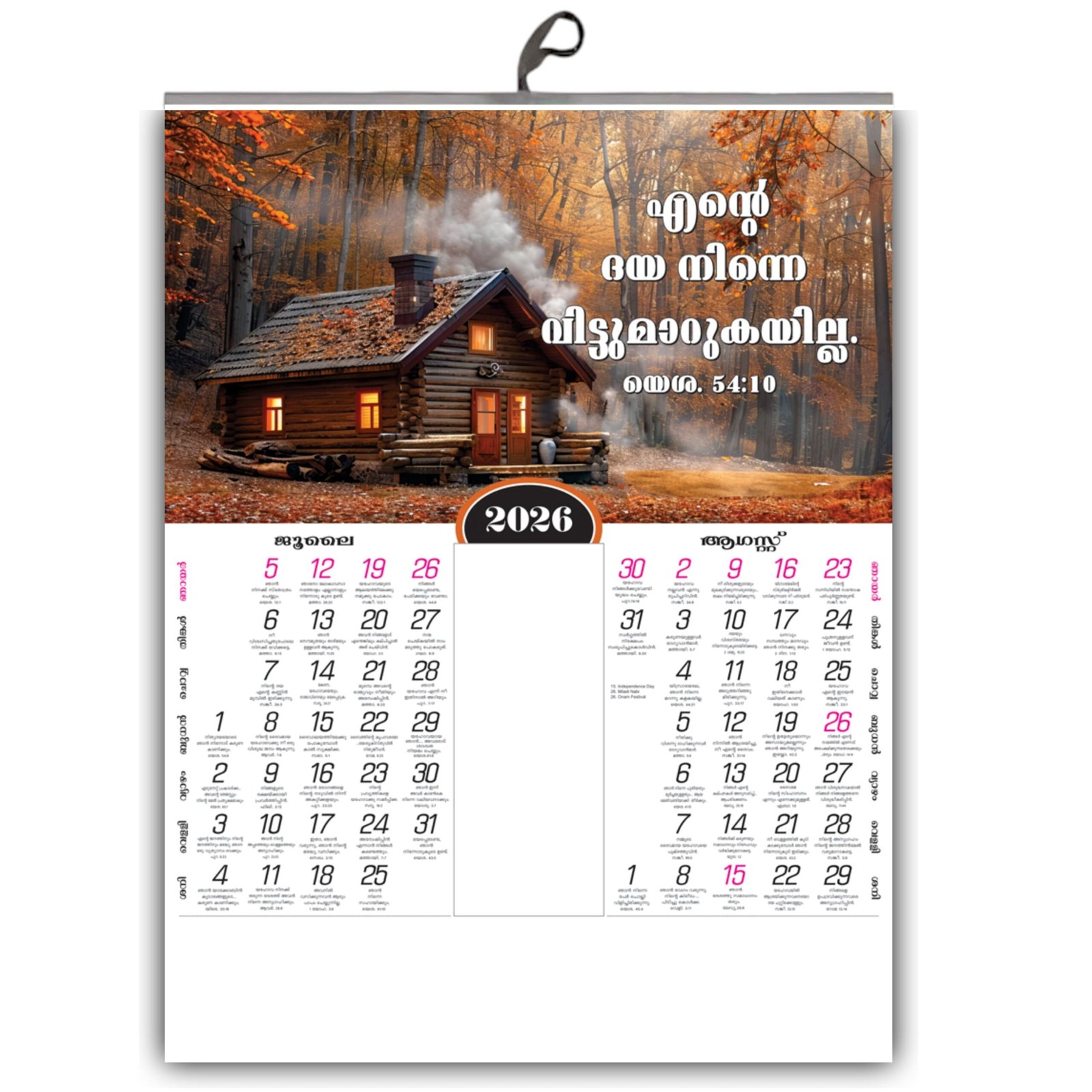 Each of the six pages presents two months, beautifully designed with a powerful Bible verse in clear, elegant Malayalam script. It’s a perfect way to keep your family’s schedule organized while keeping God’s promises at the center of your home. The large format makes the sacred verses a prominent and uplifting part of your daily life.