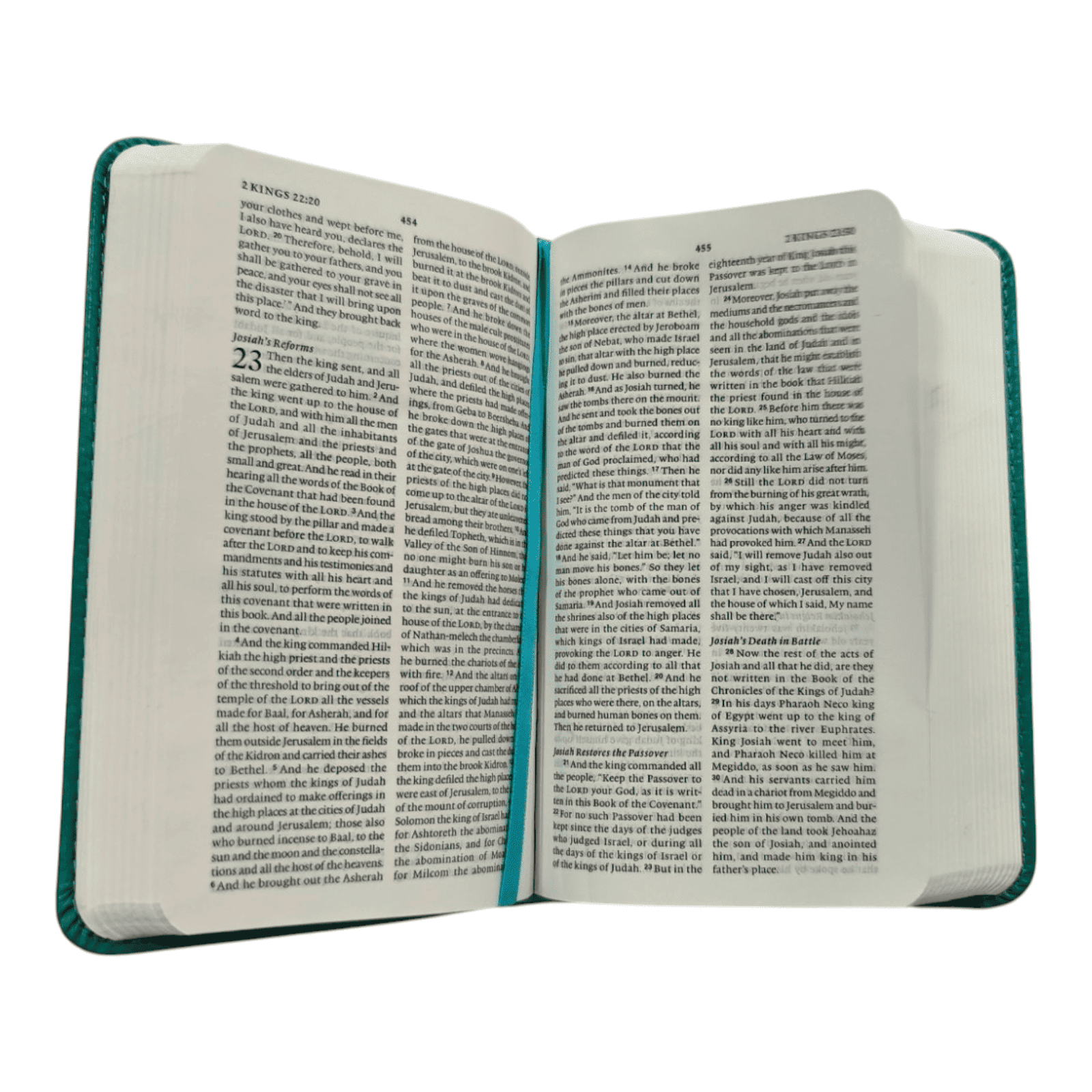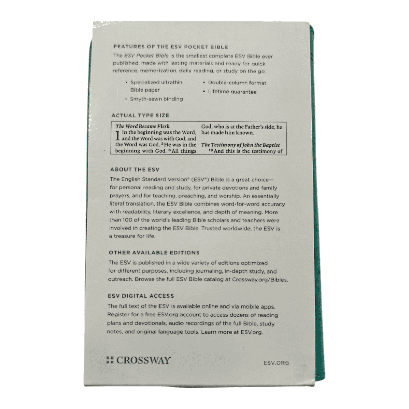 Inside, you’ll find the full text of the English Standard Version (ESV), a translation celebrated for its word-for-word accuracy and literary excellence. Despite its small footprint, this Bible is designed for clarity and features a durable Smyth-sewn binding that allows it to lay flat when open.